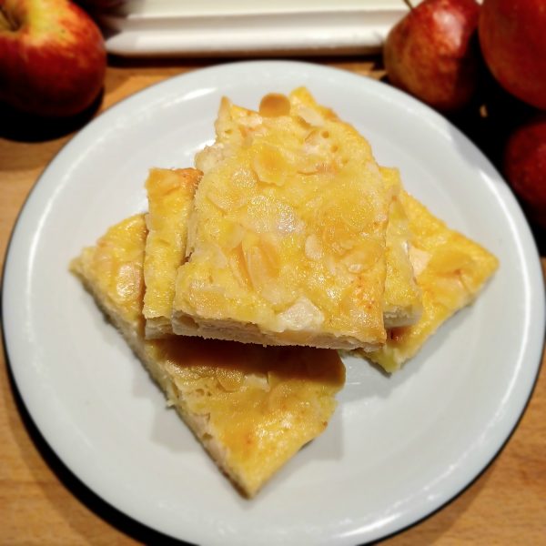 - Den Teig auf das vorbeitete Backblech geben und gleichmäßig verstreichen. Die Apfelstückchen darauf verteilen. Die gehobelten Mandeln drüberstreuen. Zum Schluß den Vanillezucker darauf verteilen. Etwa 20 Minuten backen.