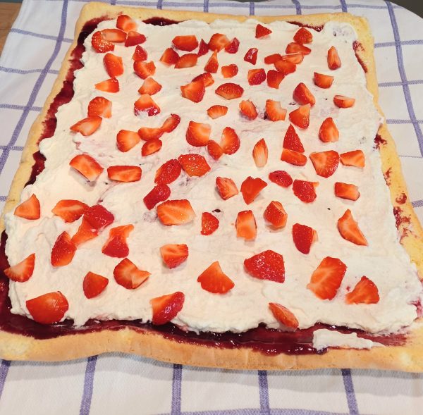- Für die Füllung die Sahne mit Sahnesteif und Vanillezucker steifschlagen. Das abgekühlte Biskuit vorsichtig abrollen und erst mit der Marmelade und dann mit der geschlagenen Sahne bestreichen. Die vorbereiteten Erdbeeren daraufgeben und das Biskuit wieder aufrollen.