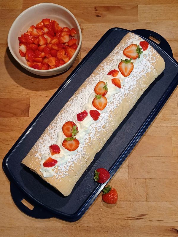 Biskuitteig bietet viele Verwendungsmöglichkeiten. In diesem Rezept hab ich ihn zu einer Erdbeer-Biskuitrolle verarbeitet. Fruchtig, leicht, lecker! Die Rolle ergibt etwa 12 Scheiben.