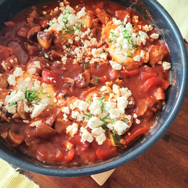 Shakshuka ist ein würziges, vegetarisches Wohlfühlgericht aus Nordafrika und der Levante: Eier werden in einer aromatischen Tomaten-Paprika-Sauce pochiert, verfeinert mit Zwiebeln, Knoblauch und Gewürzen – perfekt, um es direkt aus der Pfanne mit frischem Brot zu genießen. Schnell zubereitet.