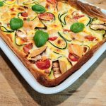 - Alles mit der Eiermischung übergießen und mit Ziegenkäse bestreuen. Bei 160 Grad Umluft etwa 25-30 Minuten goldbraun überbacken. Kurz abkühlen lassen und noch warm servieren.